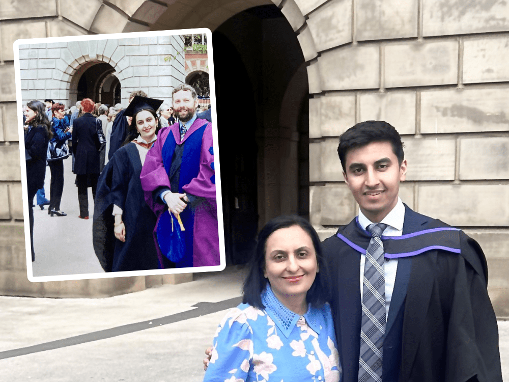 ‘25 years later in July 2025, I took a trip down memory lane, proudly attending my son Aryan’s graduation and taking photos in the exact same spot as I did with my personal tutor Dr Cillian Ryan.